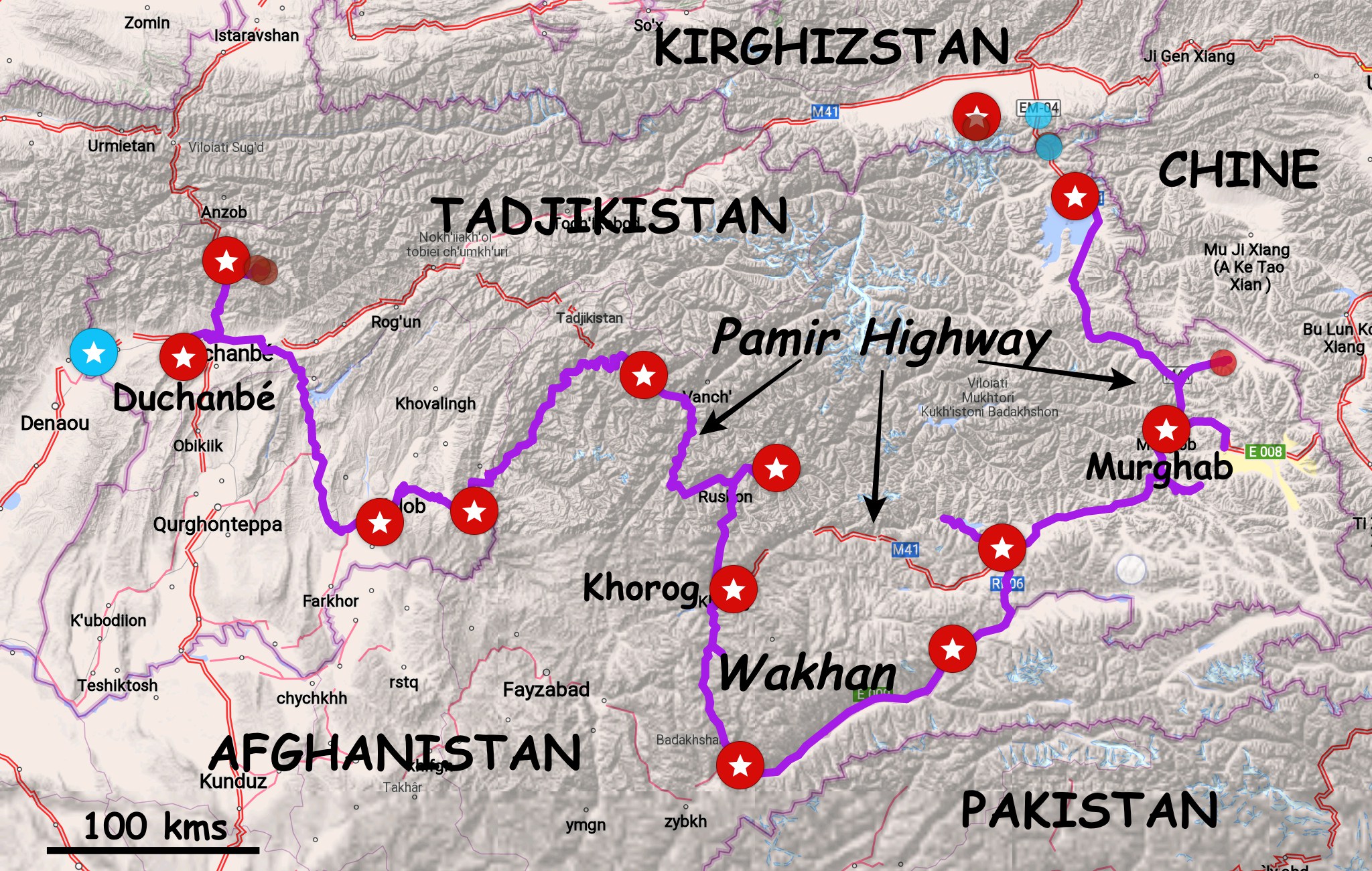 Et puis un peu plus en détail notre trajet au Tadjikistan : 1900 kms en 13 jours, beaucoup trop court, nous y reviendrons…