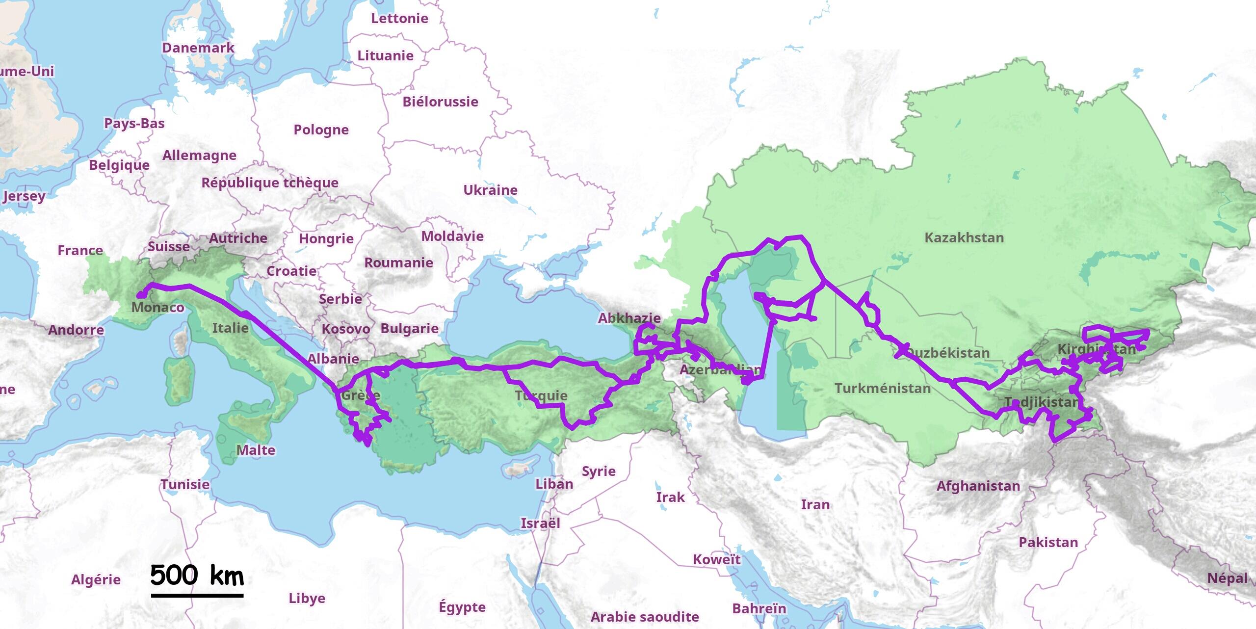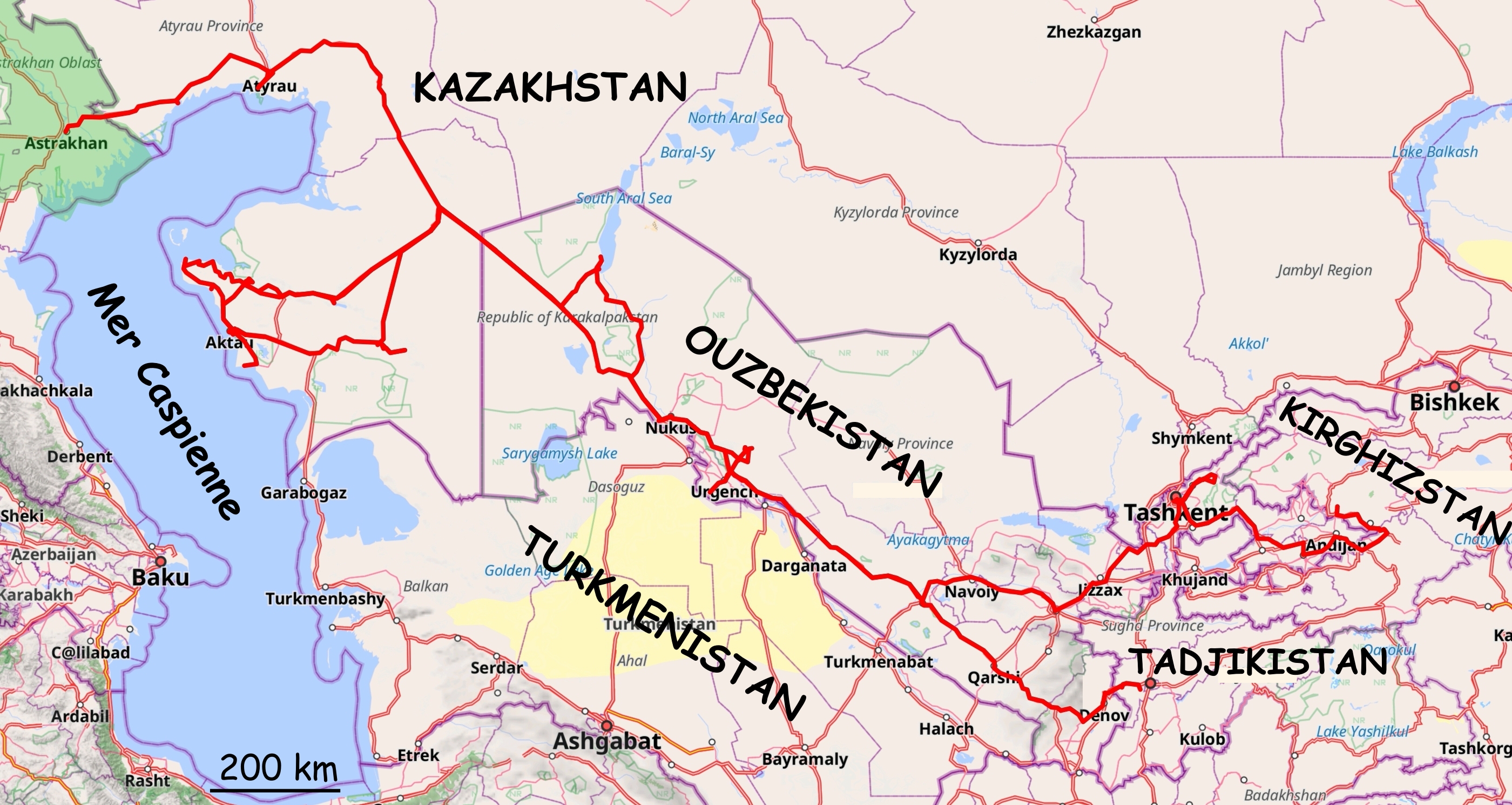 Nous sommes passés au Kazakhstan, et plus particulièrement dans l’Oblast de Manghistaw (absolument magnifique) à l’aller et retour. Idem pour l’Ouzbekistan. Le chemin parcouru est visible ci-dessous.