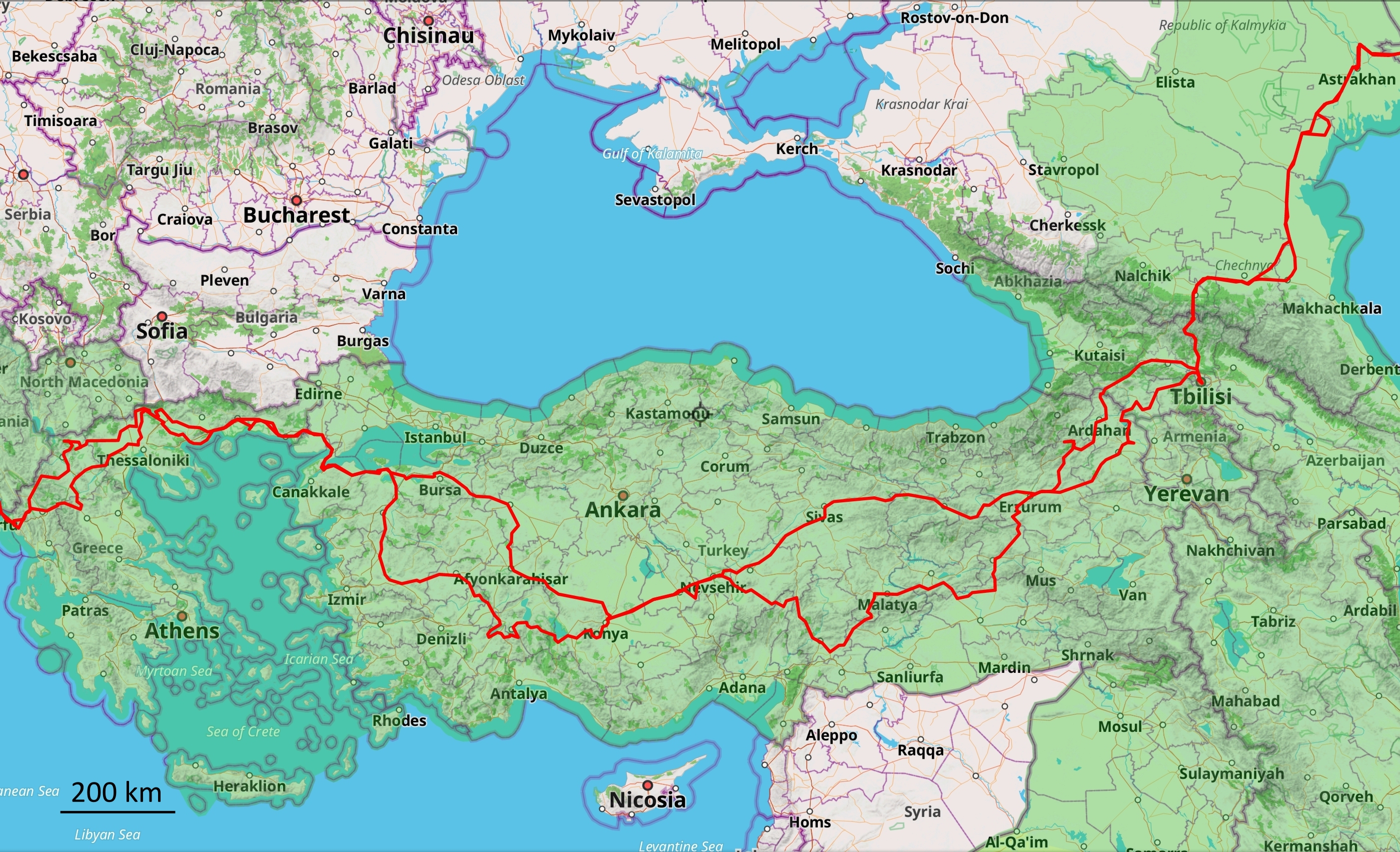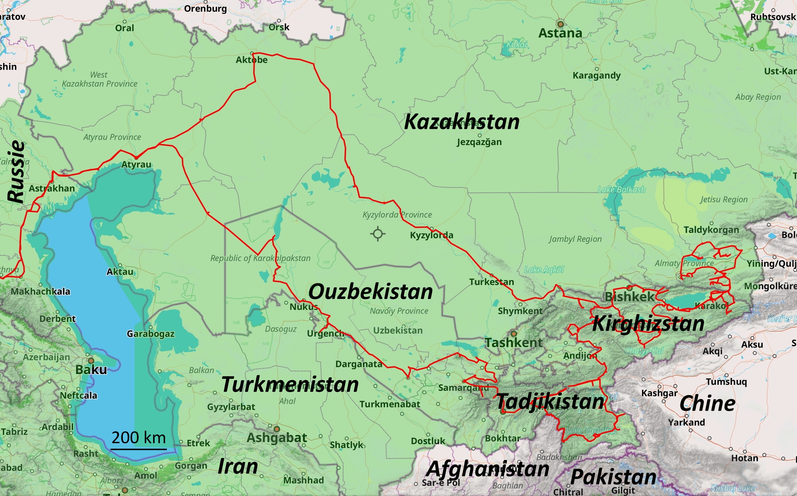 Voilà ci-dessous le trajet que nous avons fait à l’aller pour rejoindre l’Asie Centrale, et au retour pour en revenir. Environ 6000 kilomètres dans chaque sens.