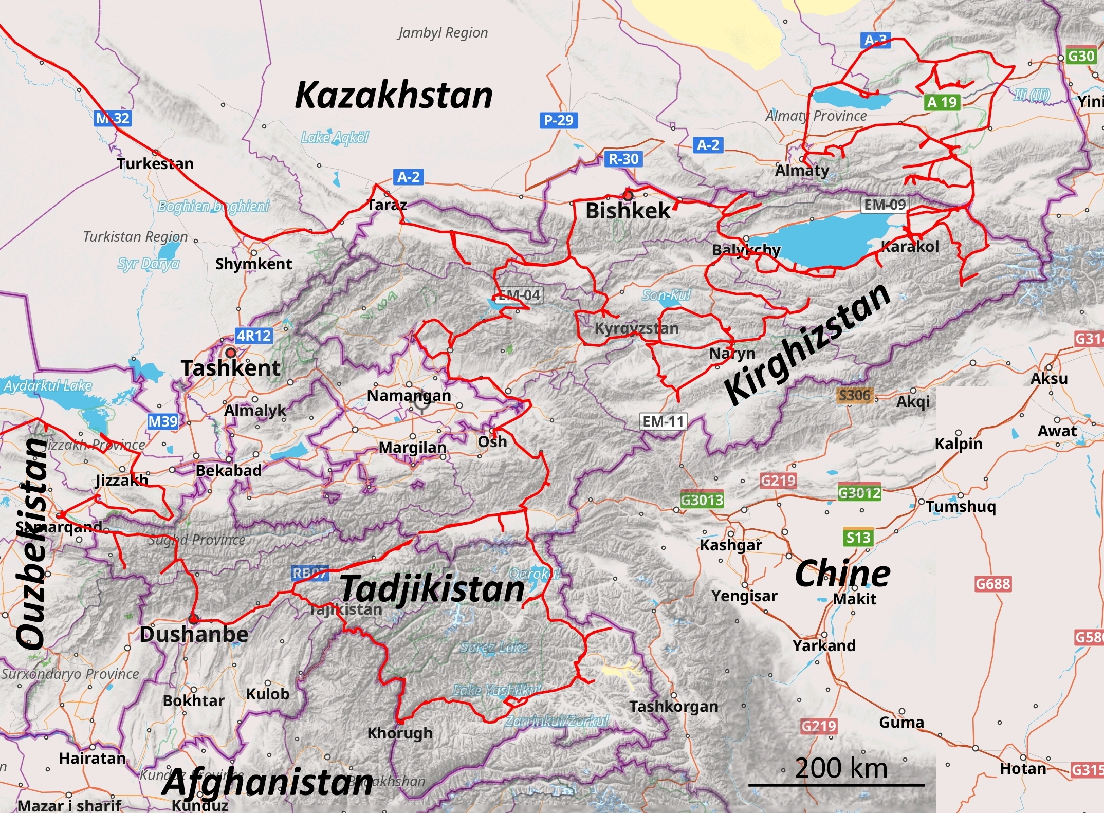… avec un zoom sur l’ouest d’Almaty, le Kirghizstan et le Tadjikistan où nous avons fait environ 9500 kilomètres.