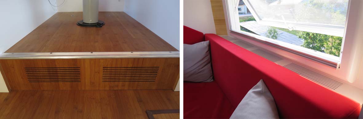 L’air que réchauffe les radiateurs circule grâce aux ouvertures pratiquées dans les plinthes et derrière les dossiers.
