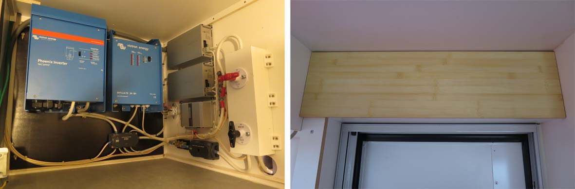 La partie puissance (chargeur, convertisseur et câblage jusqu’au panneau électrique) a été réalisée par Christian et le tableau électrique est bien caché au dessus de la porte !