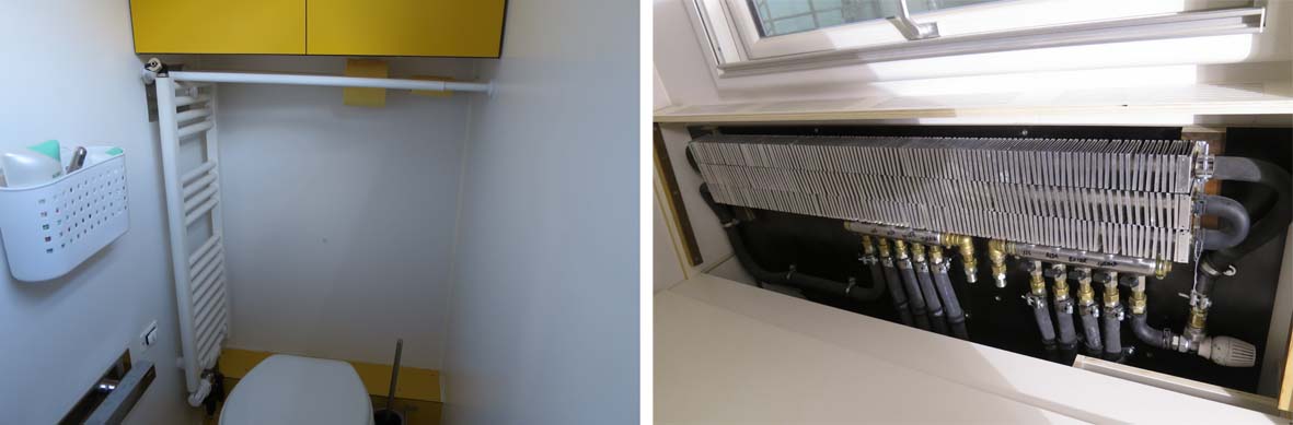 Si besoin, il est possible de faire passer le retour du radiateur de la salle de bain par la cuve d’eaux grises pour éviter qu’elles ne gèlent en cas de grand froid.