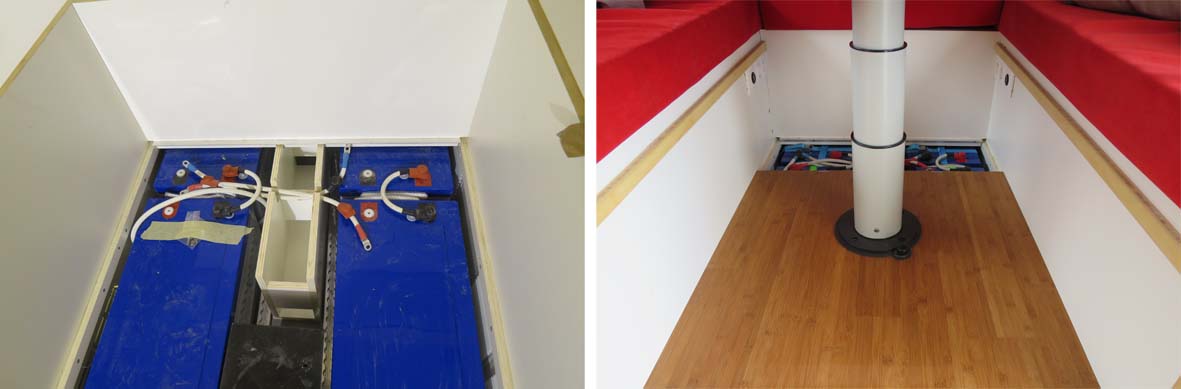 Le système a été étudié avec la plus grande attention par Christian… mais les plans sont top secrets ! Nous avons 4 batteries AGM pour la partie habitable, qui peuvent se recharger soit lorsque le moteur tourne, soit grâce aux panneaux solaires, soit par un chargeur en se branchant sur une prise extérieure. Ces batteries sont dans la cellule, sous la table.
