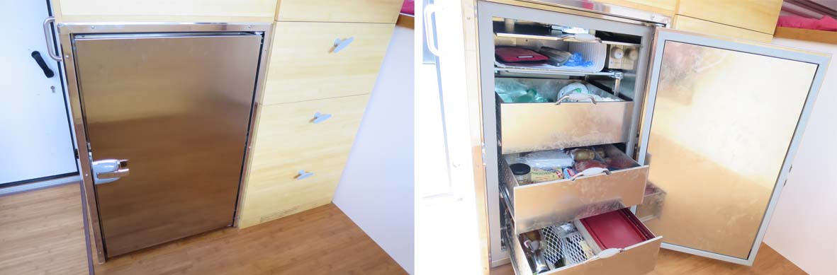 - Nous avons une réfrigérateur de chez Frigonautica, 160 litres incluant un petit freezer, avec un compresseur électrique 24V DC déporté dans la soute arrière pour éviter le bruit et la surchauffe dans la cellule habitable. Il présente de plus l’avantage d’être entièrement en inox, et d’avoir des tiroirs et non des planches permettent ainsi un accès aisé aux aliments stockés et une totale occupation du volume.