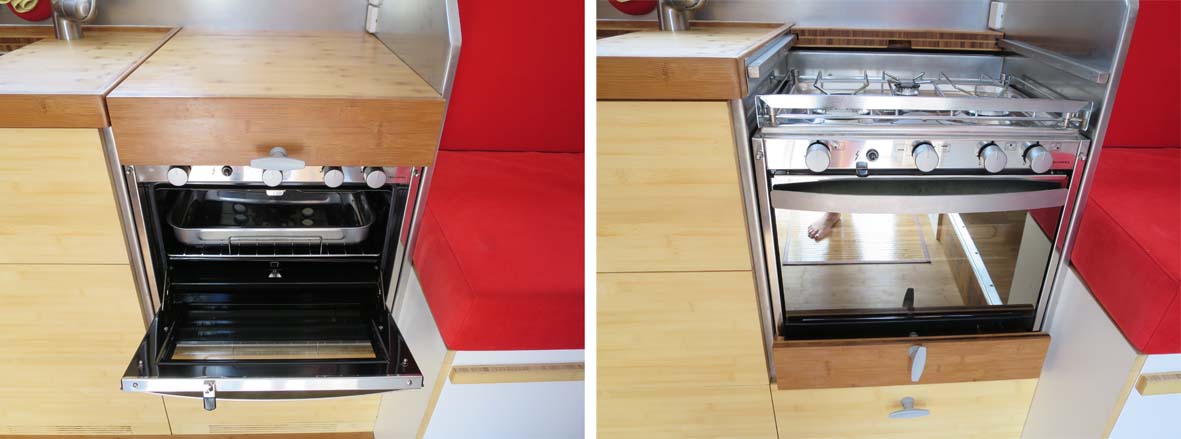 - La gazinière (Techimpex) combine 3 feux et un four. Un astucieux système de couvercle possédant son espace de rangement sous la gazinière permet de récupérer de la surface utile lorsque les feux ne sont pas utilisés.