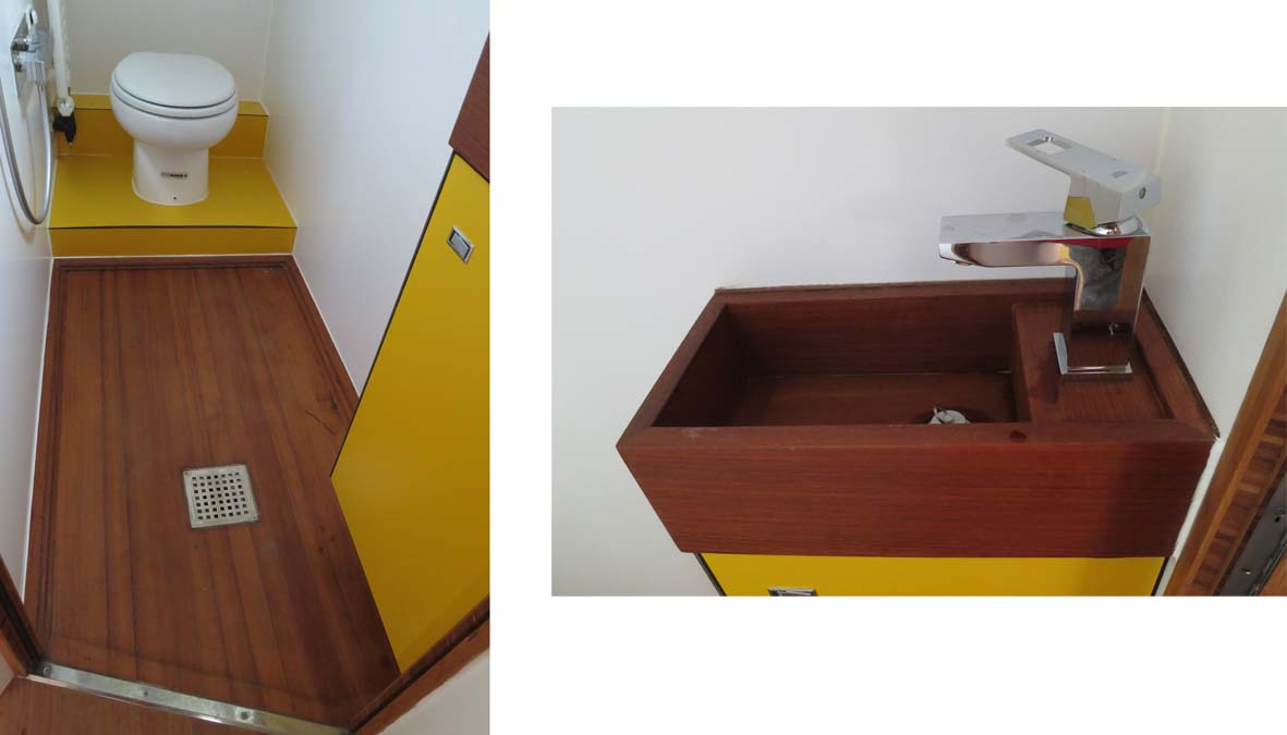 - L’ensemble de l’espace restant est utilisé pour la douche, avec un réceptacle en bois exotique en très légère pente vers une bonde de grande taille. L’ensemble permet une bonne évacuation de l’eau même si l’horizontalité du véhicule n’est pas parfaite. Et le bois offre une surface non glissante et au contact agréable.