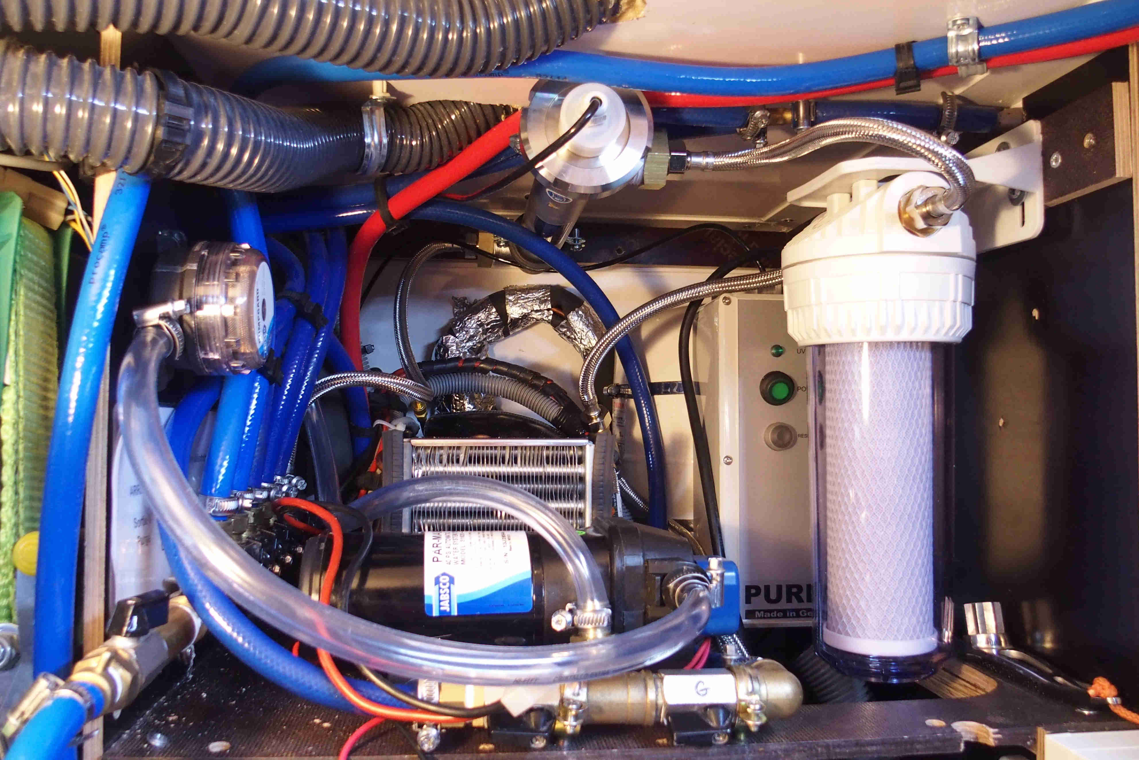 Nous avons réussi à tout reconfigurer, et voilà à quoi ressemble maintenant notre système. Le chauffe eau (40 litres), qu’on ne voit pas sur la photo, a la particularité de pouvoir être alimenté par l’installation électrique ou par la chaudière. Et les ailettes que vous voyez au fond sont celles du groupe déporté du frigo (voir plus loin).