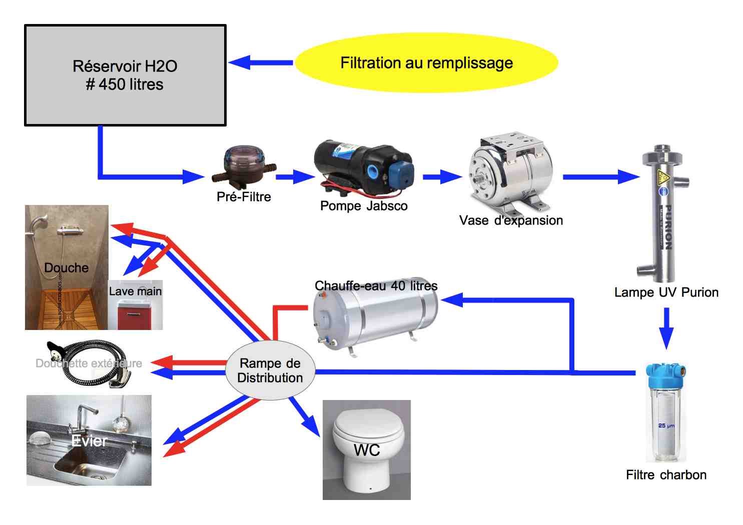 Nous avons donc changé l’installation pour un système avec une lampe UV de chez Purion associée à un filtre charbon. Voici schématiquement comment est construite notre installation.