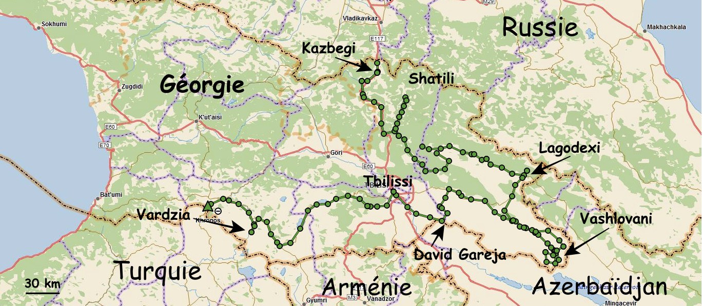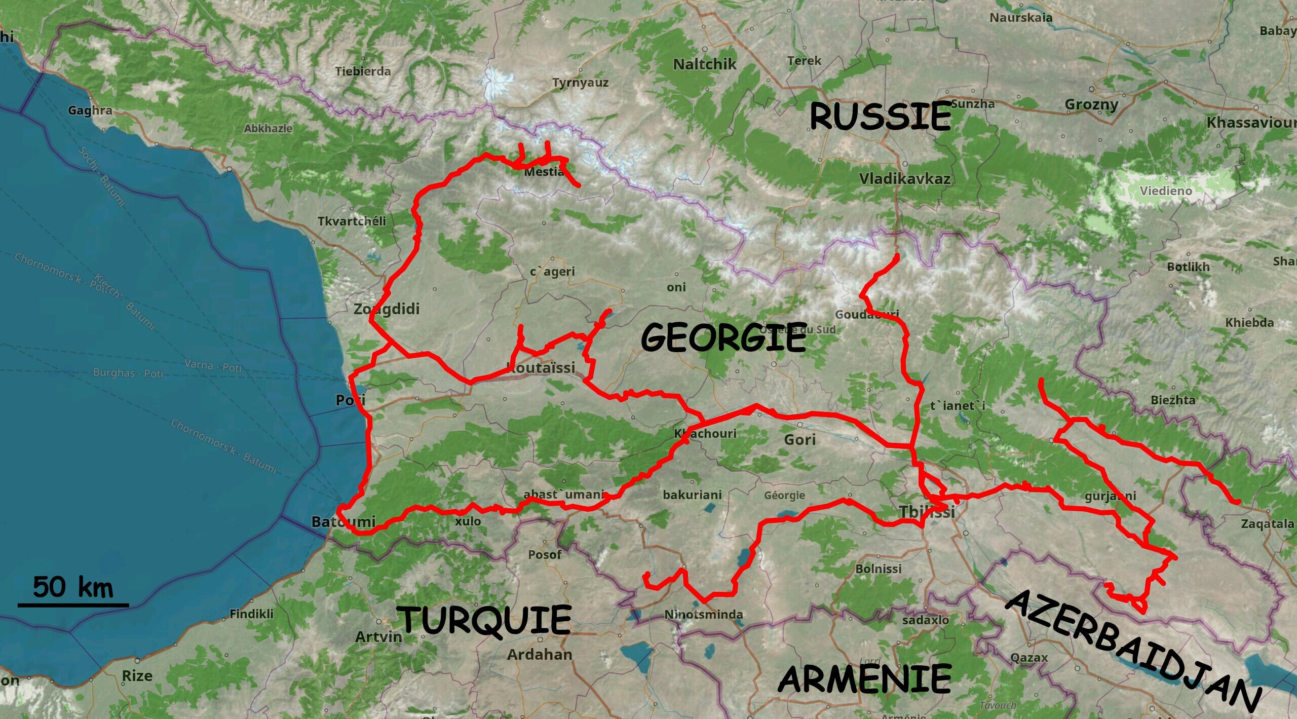 En 2019, nous avons rapidement traversé la Géorgie en route vers l’Asie Centrale, et avons pris le temps d’y séjourner une quinzaine de jours sur le chemin du retour. Ci-dessous un aperçu de notre itinéraire incluant l’aller et le retour.